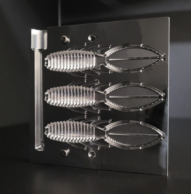 2 piece three cavity injection mold. Appendages are "tacked" together to make a versatile bait.