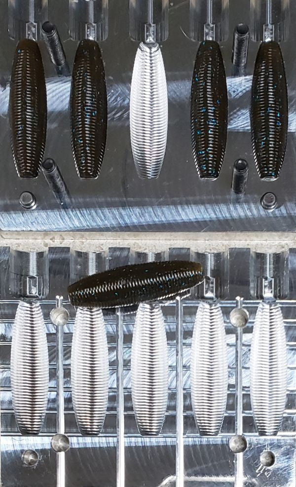 Create 2.1" long x .634" diameter disco grub bodies with this 5-cavity mold. Enhance their appearance by pairing with a skirt mold of your choice. These solid bodied grubs are designed for use with either skirt mold.
