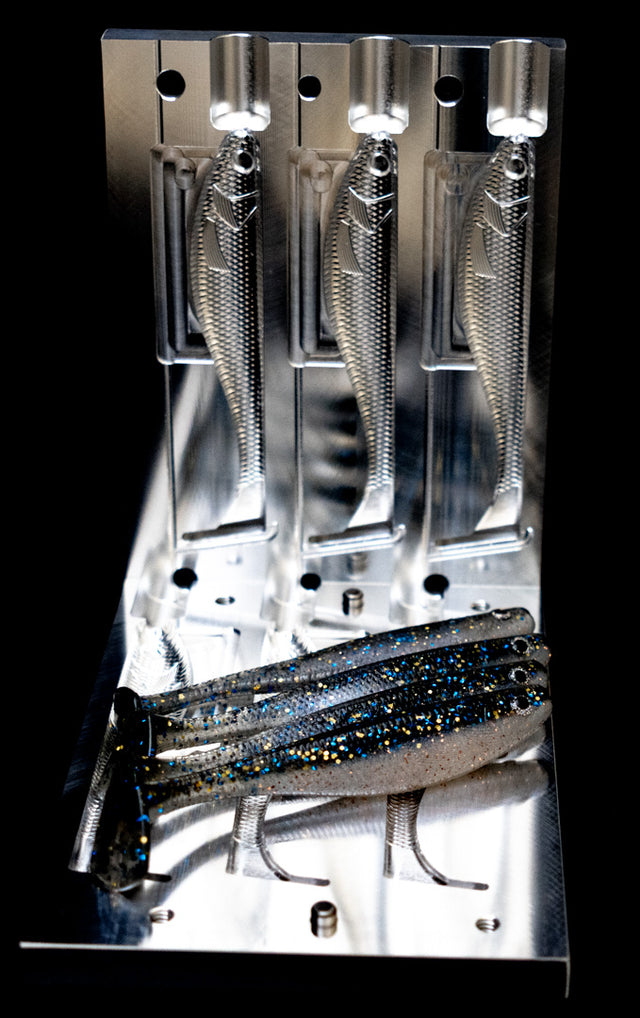 5" DR Swim Bait Mold- 3 cavity-Single Top Ports allow for making Top and Bottom Laminates.