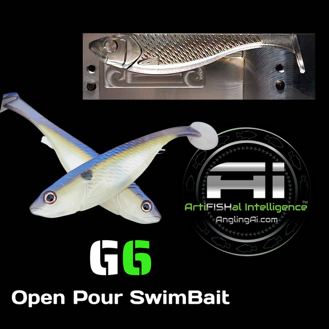 Ai G6 Open Pour Swimbait Mold- The Ai G6 is 6-inches in length and allows bait makers to open their creative minds. Sides of the mold are flatter to allow better control when pouring intricate designs to take advantage of the scale pattern. Other details of the G6 feature a jawline, gill plates, and eyebrows to complete the head. The bait will utilize 8mm eyes and features two unique fins. The tail design is thinner giving the bait a tighter tail kick swimming action, and available 6" Half Moon Hook Slot Deletes will also work to create solid swim baits. Half Moon Hook Slot deletes can be found in the accessories section of the website.