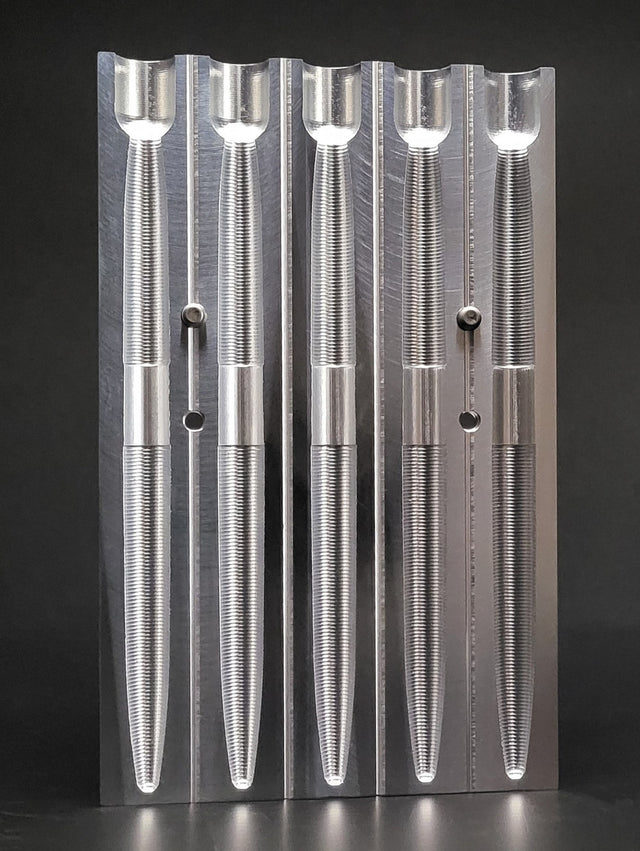 Top Pour 7.0" Old Skool Stick Bait, it is .49" at its fatest point. 5 cavity top pour. Mold is a top port two piece mold. Injection is possible with the mold, but mold is designed for hand pours.