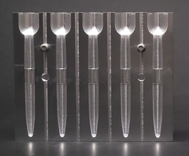Top Pour 3.2" Old Skool Stick Bait, it is .33" at its fatest point. 5 cavity top pour. Mold is a top port two piece mold. Injection is possible with the mold, but mold is designed for hand pours.