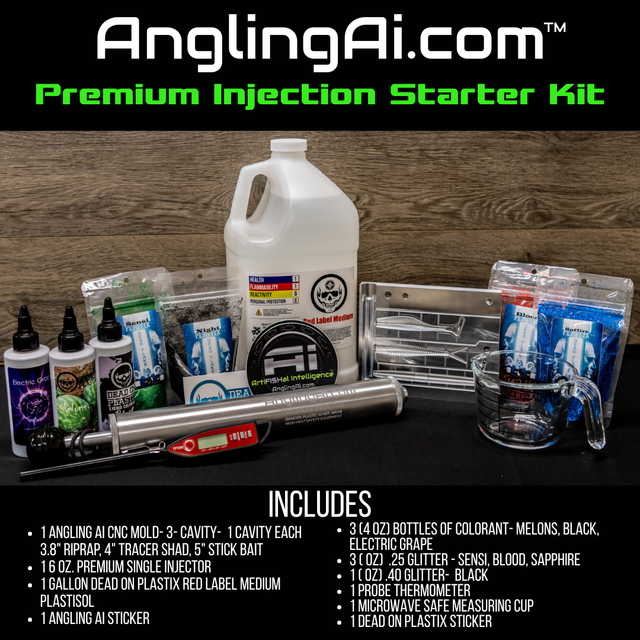This is the perfect kit to start making your own soft plastic baits. The kit comes with a CNC Aluminum (3) Cavity Injection Mold. The mold has (1) cavity of our 3 most popular molds. The starter kit also includes (1) 6 oz. Angling Ai Premium Injector. The Injector tube and nozzle are lined with PTFE and help extend the working time with your plastisol. The Nozzle and End Cap feature a special 5 lead screw-lock design for protection when working with hot plastisol. Other included items are: (1) Gallon of Red Medium Plastisol, (3) 4 oz. bottles of color from Dead On Plastix, (4) 3oz. net weight bags of glitter, a probe thermometer, a microwave-safe measuring cup, and (2) Angling Ai and Dead On Plastix Stickers. Make some of your old-time favorite colors: Watermelon Red, Black and Blue, June Bug, and many more