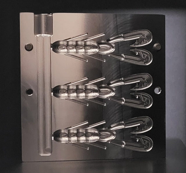 3.5" AR-S Craw Mold- (3)-Cavity or (6)-Cavity- The 3.5" AR-S Craw Mold is another must have design to add to your tackle box. The craw has a thick body providing more meat for the hook at the head, and has a mohawk hook keeper designed on top to bury your hook for superior weedless applications. We recommend 3/0 or 4/0 hook designs with the bait. Claws swim at several retrieving speeds and when jigged. The AR-S Tail Mold allows baits to be injected with different plastisol durometers for action and durability preferences. Baitmakers may also utilize the 4" Bloodline Insert Mold to help create the leg appendages as well.